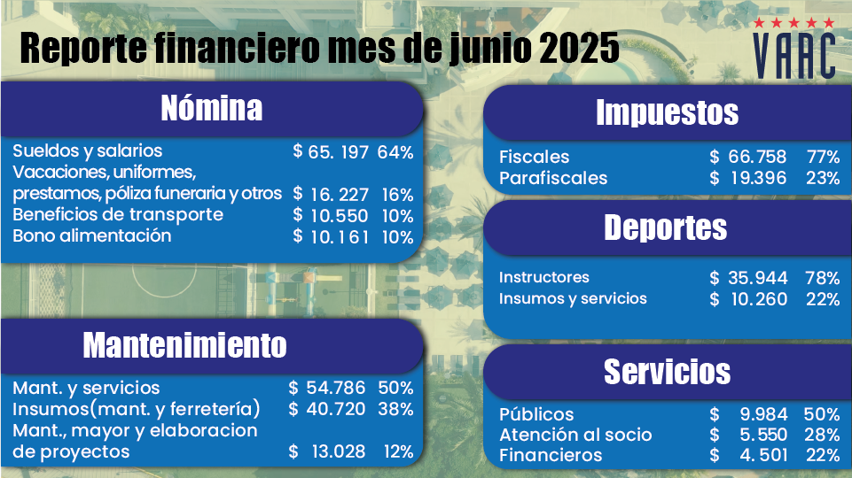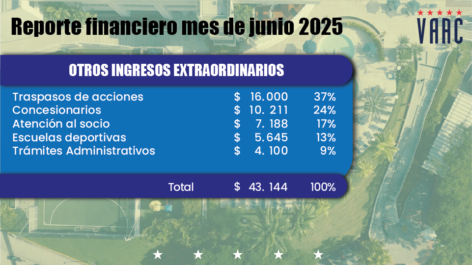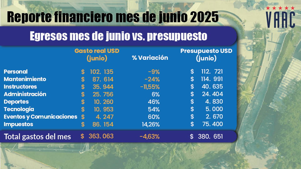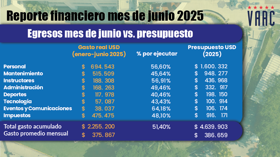 En este informe, te presentamos un vistazo a los ingresos de junio del 2025, cómo los gestionamos y las inversiones que realizamos para seguir mejorando nuestras instalaciones y servicios. Adicionalmente, hemos incorporado dos nuevas diapositivas: en la primera, podrás consultar los egresos de junio comparados con su presupuesto correspondiente; en la segunda, se muestra el acumulado de egresos de enero a junio frente al presupuesto proyectado para 2025.